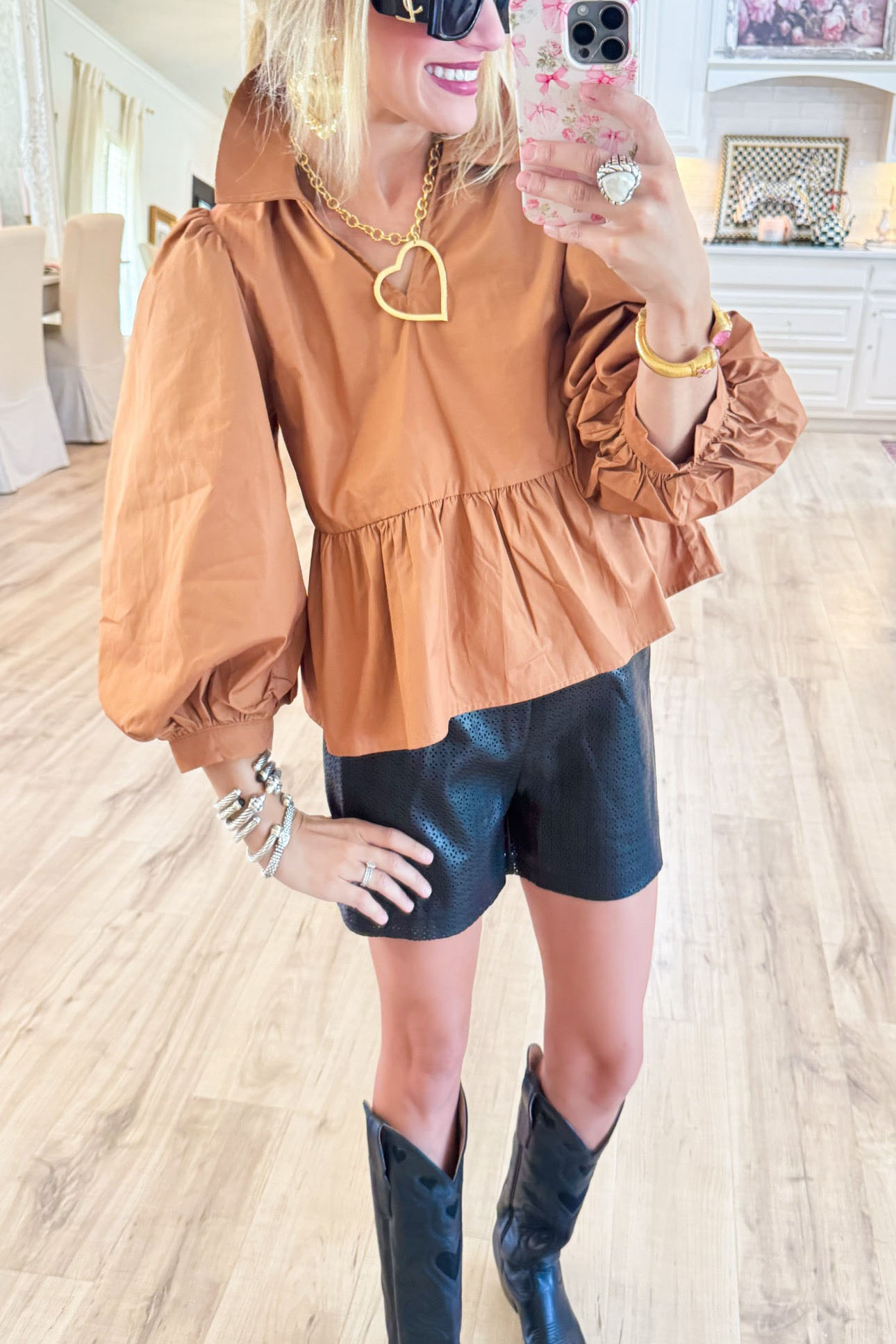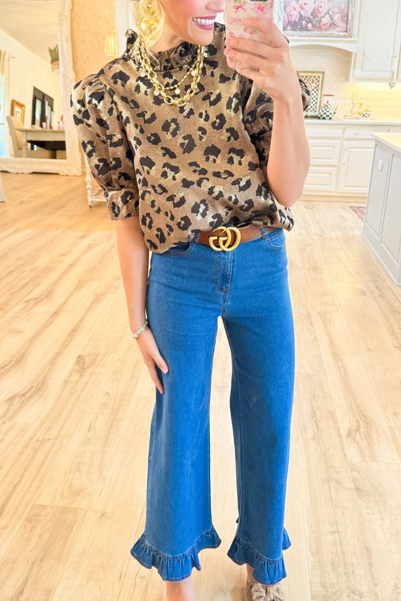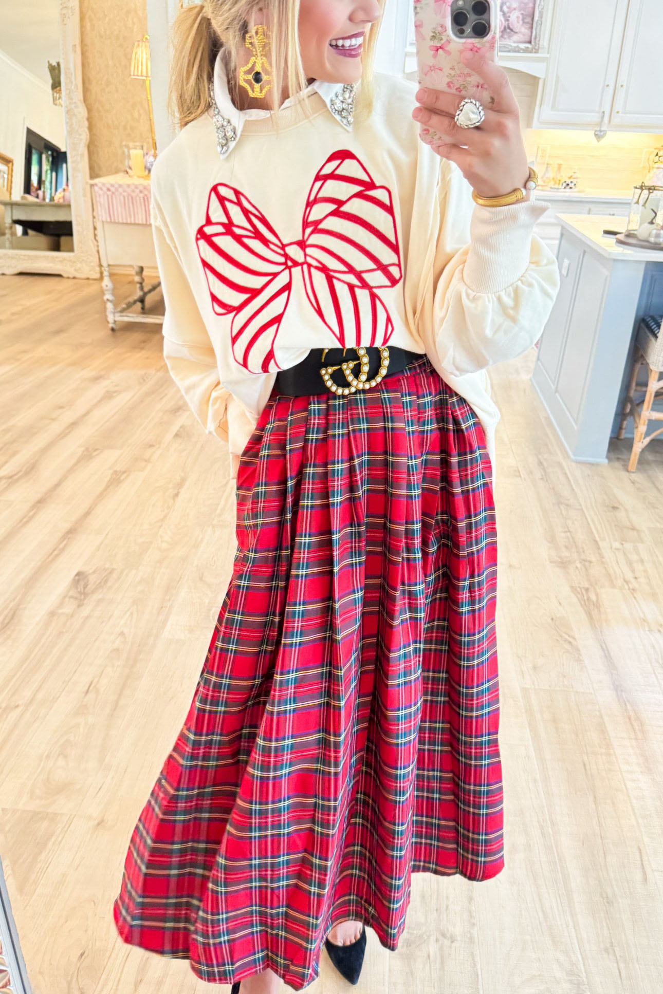 Red Plaid Puff Sleeve Ruffle Trim Blouse