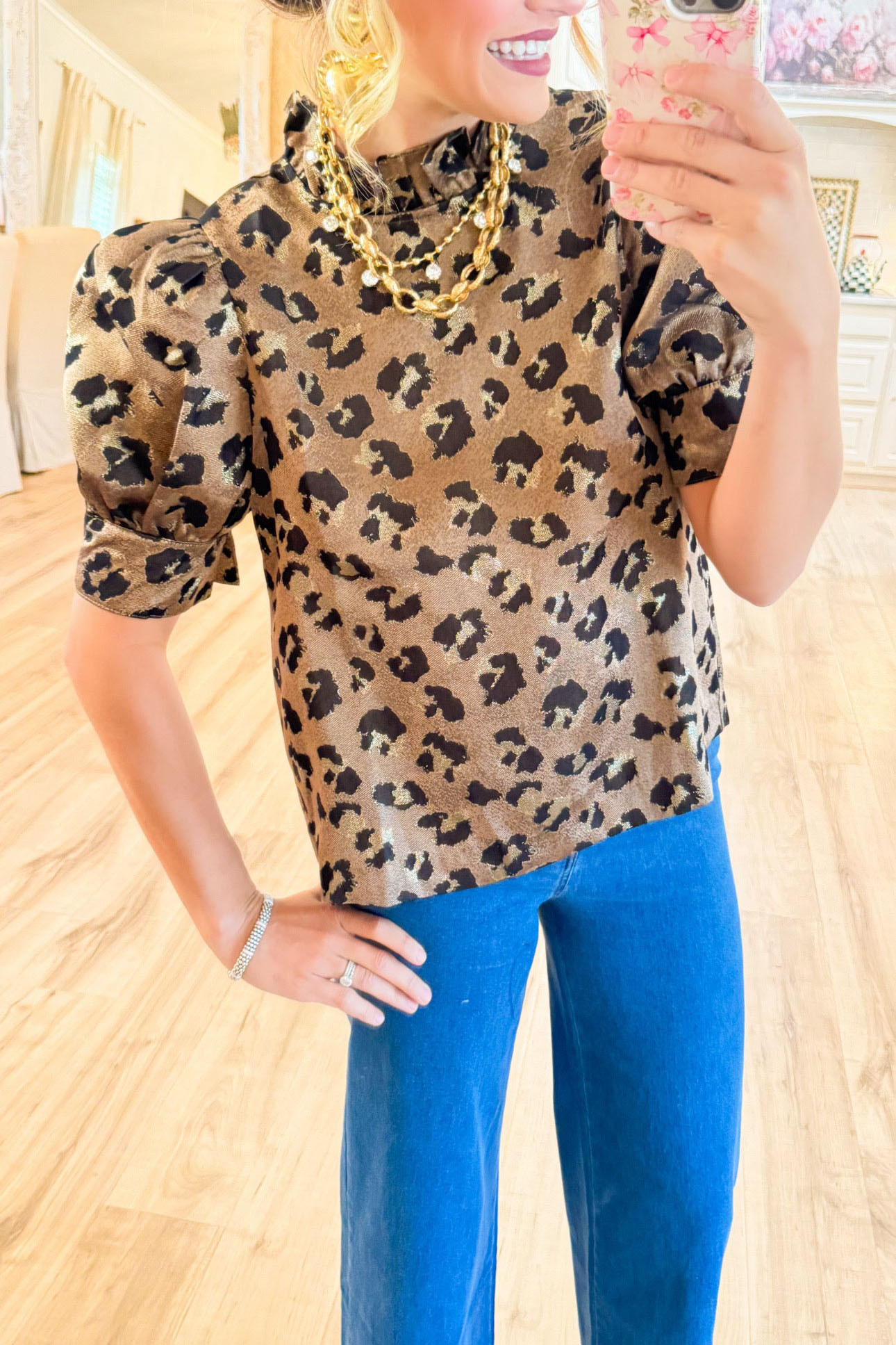 Bronze Leopard Short Puff Sleeve Top