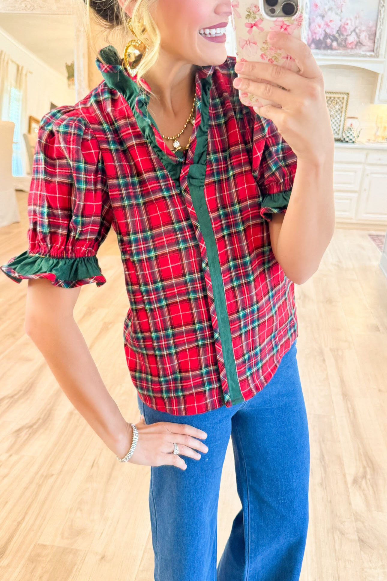 Red Plaid Puff Sleeve Ruffle Trim Blouse