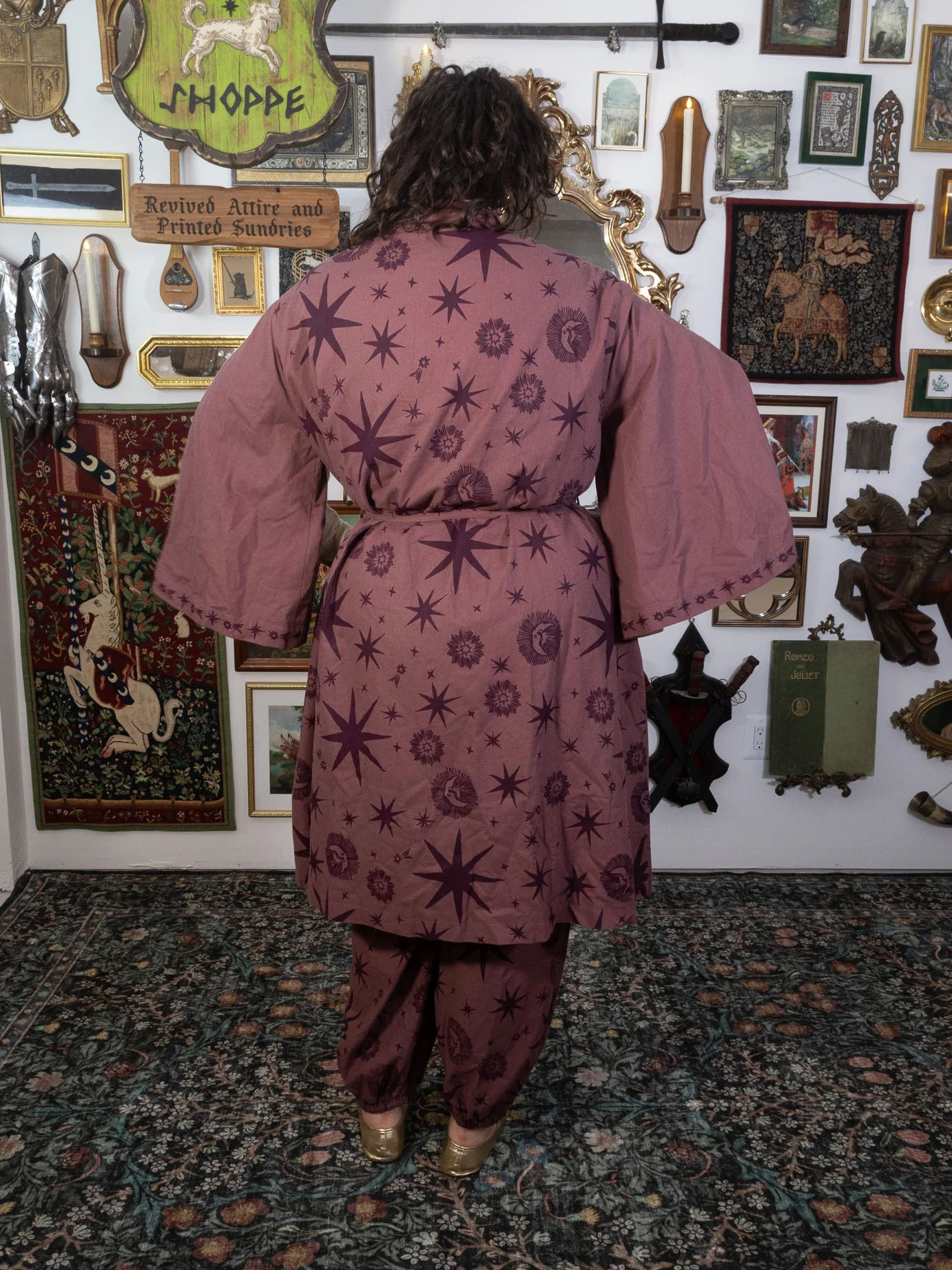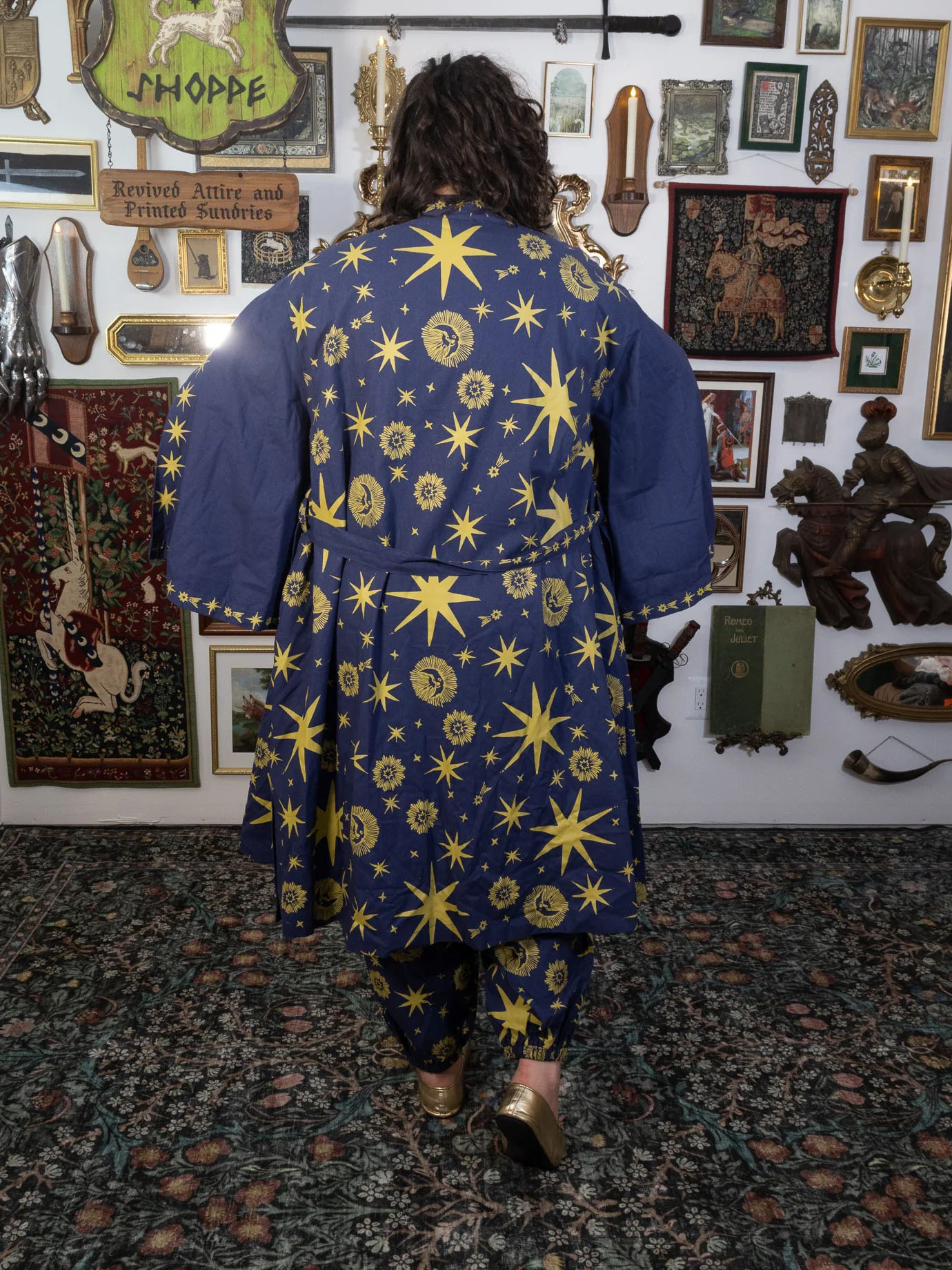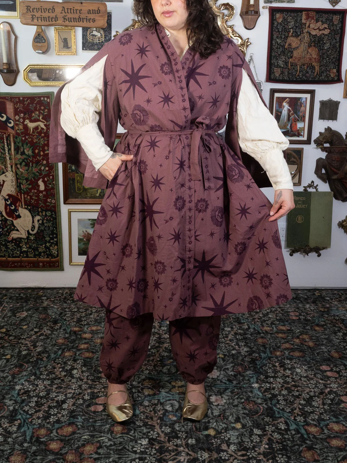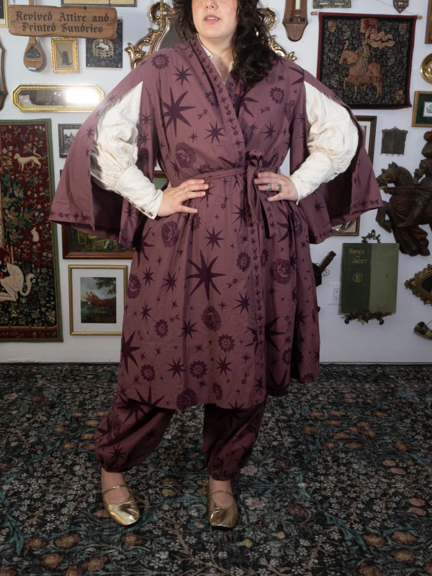 Woven for those who wander between the stars and the hearth, this robe carries the quiet magic of the cosmos. Crafted from a soft, breathable 50% Cotton + 30% Linen + 20% Polyester blend, it drapes beautifully whether you’re strolling through Renaissance faire lanes or curling up with a spellbook (or cup of tea) at home.