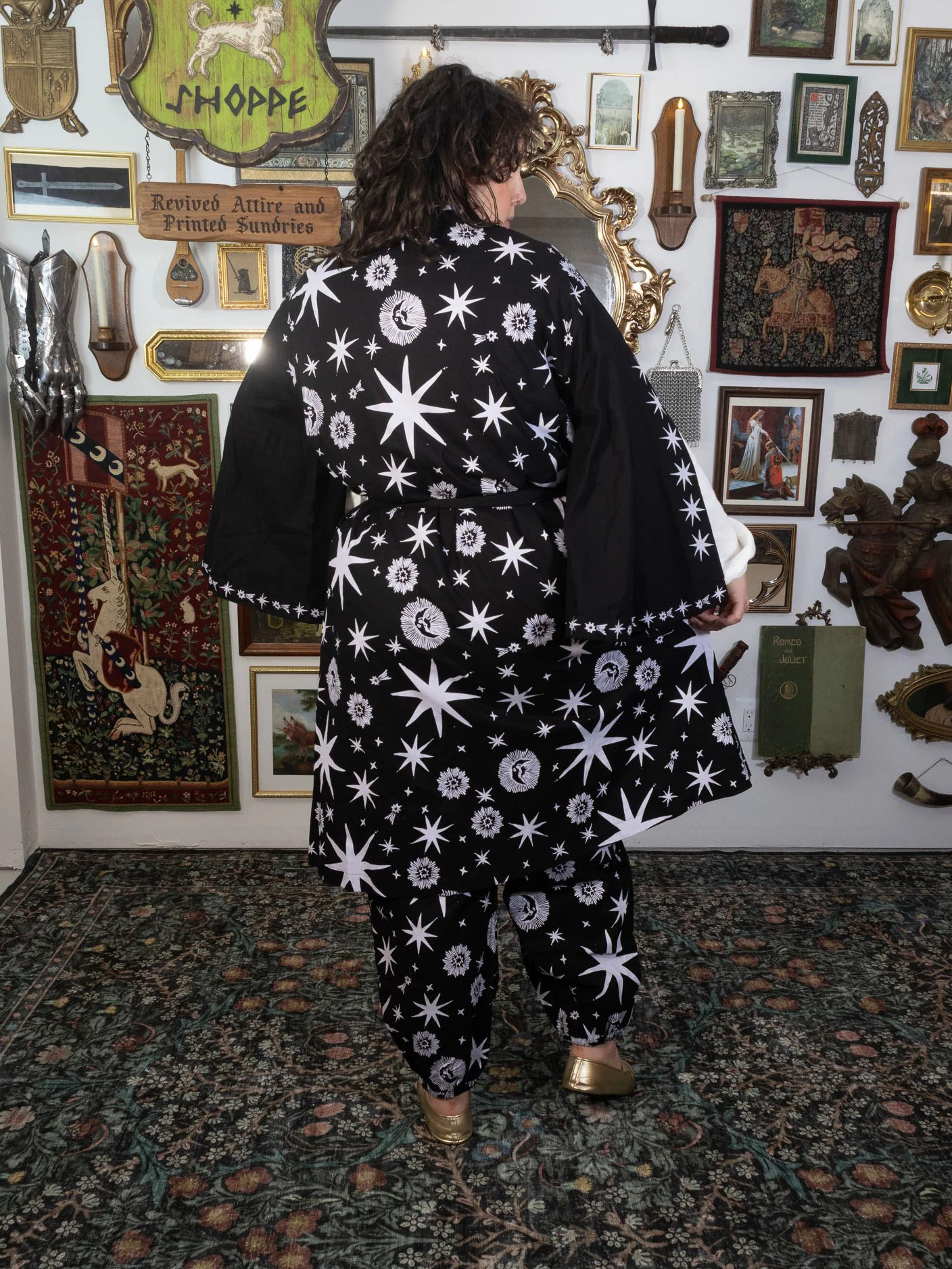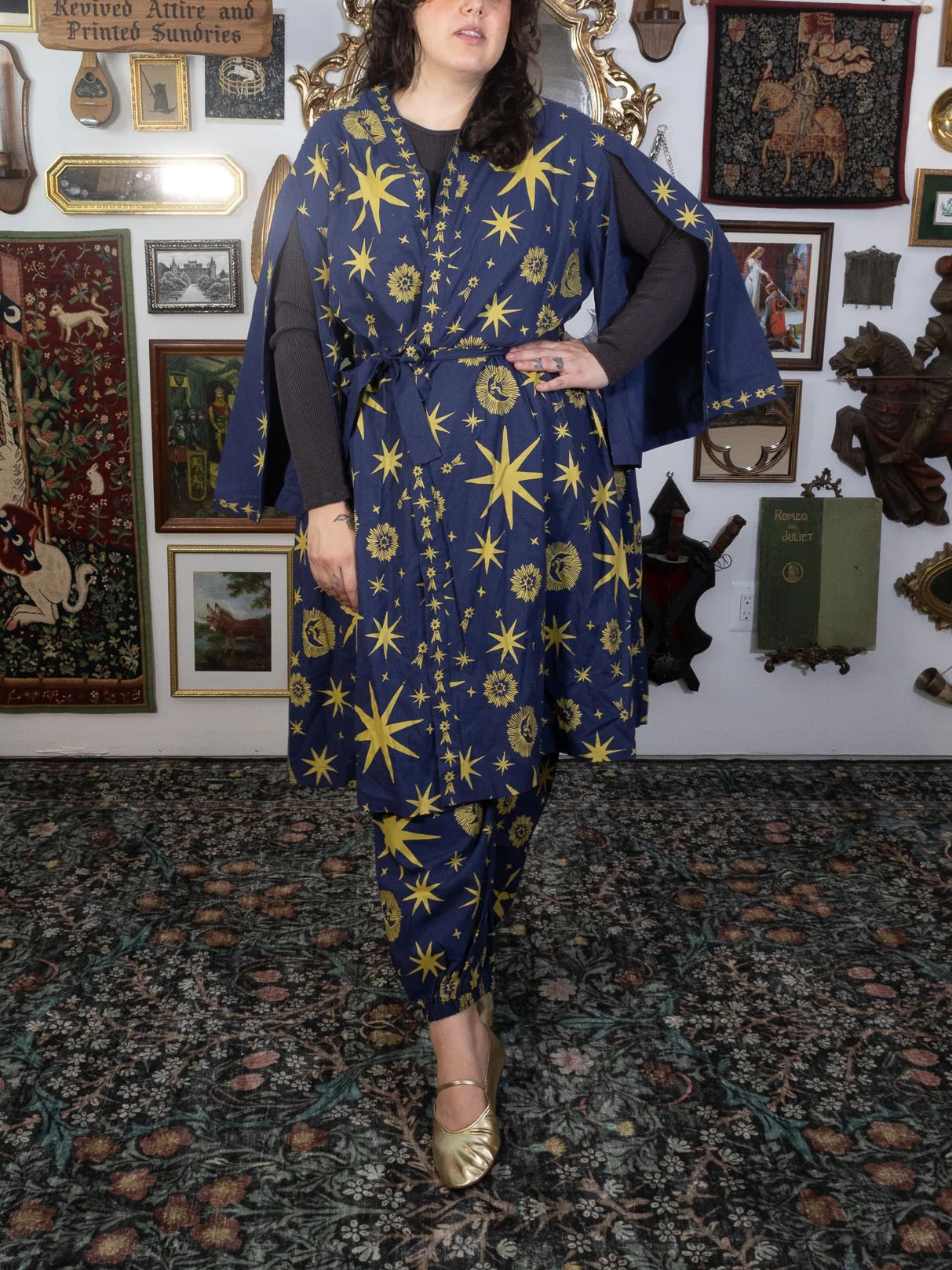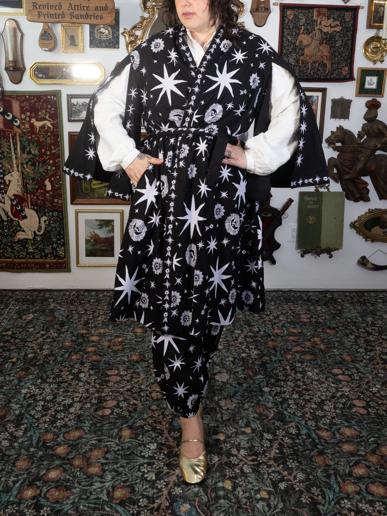Woven for those who wander between the stars and the hearth, this robe carries the quiet magic of the cosmos. Crafted from a soft, breathable 50% Cotton + 30% Linen + 20% Polyester blend, it drapes beautifully whether you’re strolling through Renaissance faire lanes or curling up with a spellbook (or cup of tea) at home.