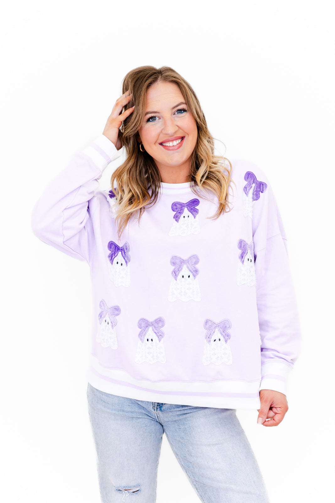 Say hello to our Ghosted & Gorgeous Lace Ghost Patch Sweatshirt.A soft and spooky must-have for the season! Perfect for cozy nights in or festive fall outings, this adorable sweatshirt is giving all the Halloween vibes with a girly twist. Pair it with leggings, denim, or even a cute mini skirt for the ultimate ghost girl moment