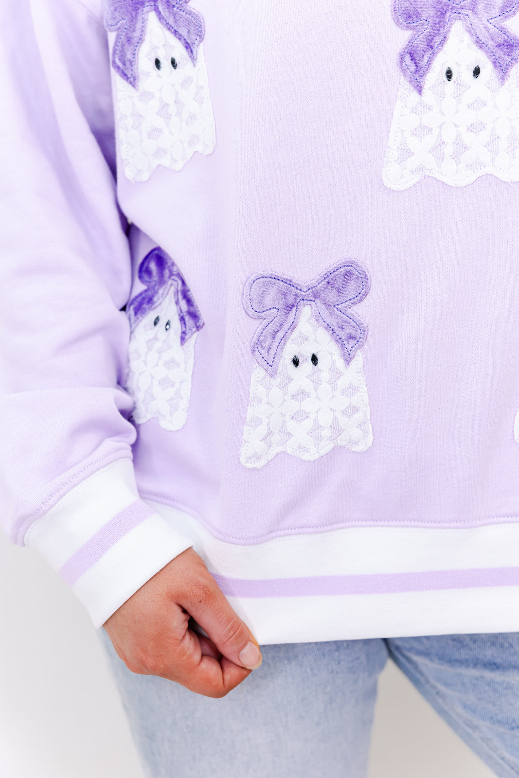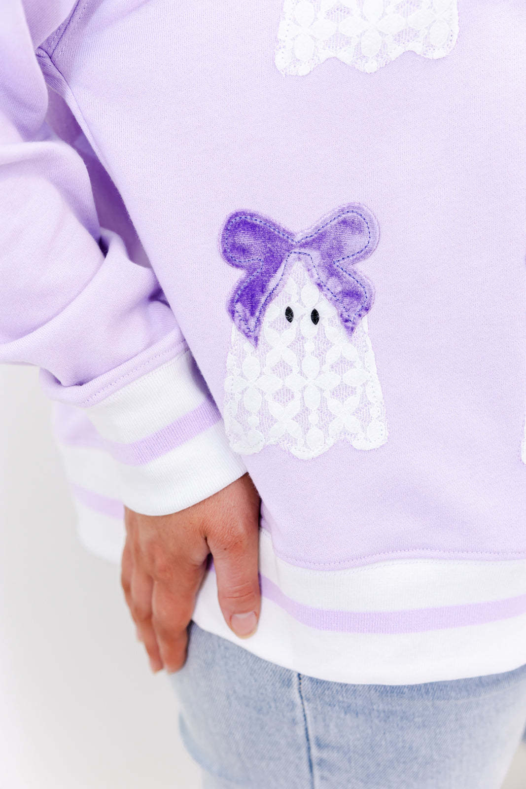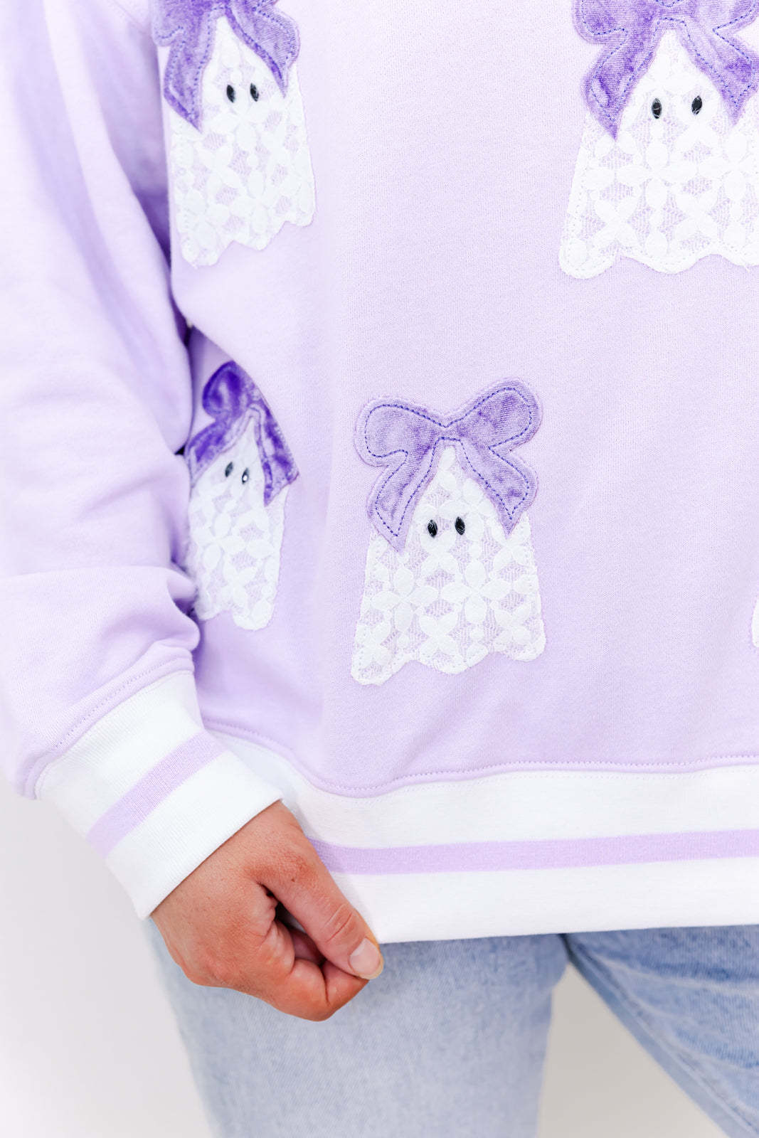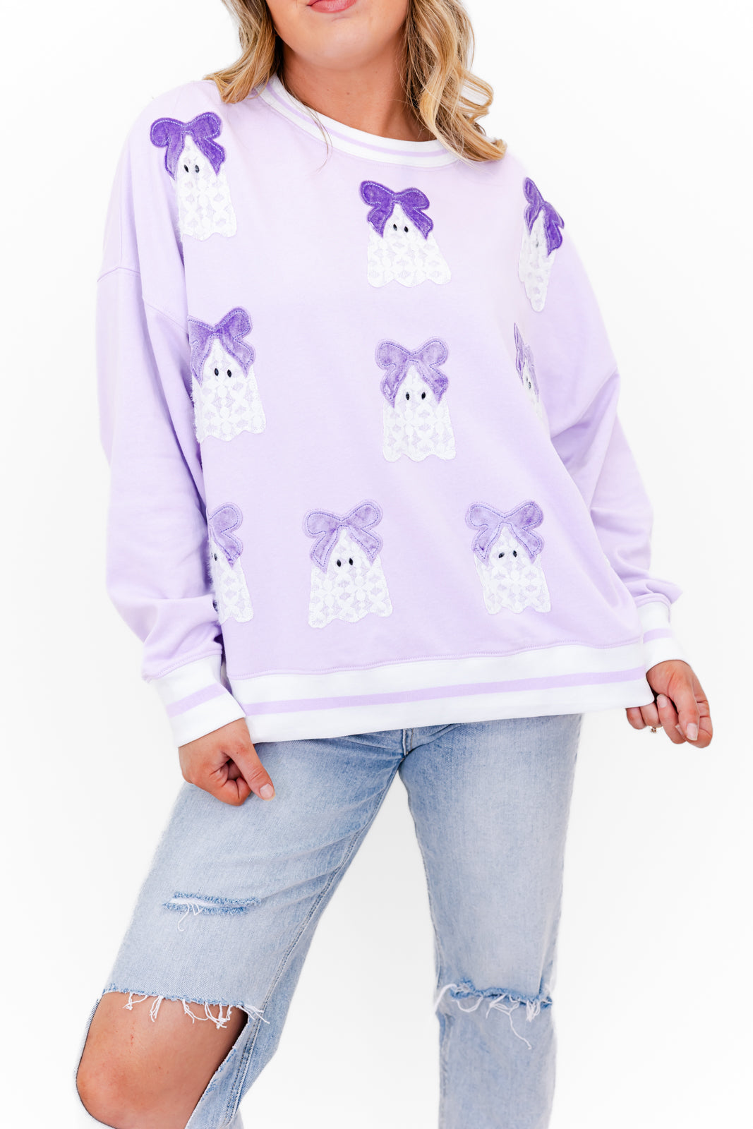 Featuring a plush french terry knit fabric, contrasting striped ribbed neckline and hem, drop shoulder long sleeves, and a relaxed full-length fit. Finished with the cutest chenille lace ghosts, each topped with a velvet bow and sweet googly eyes all over the front.