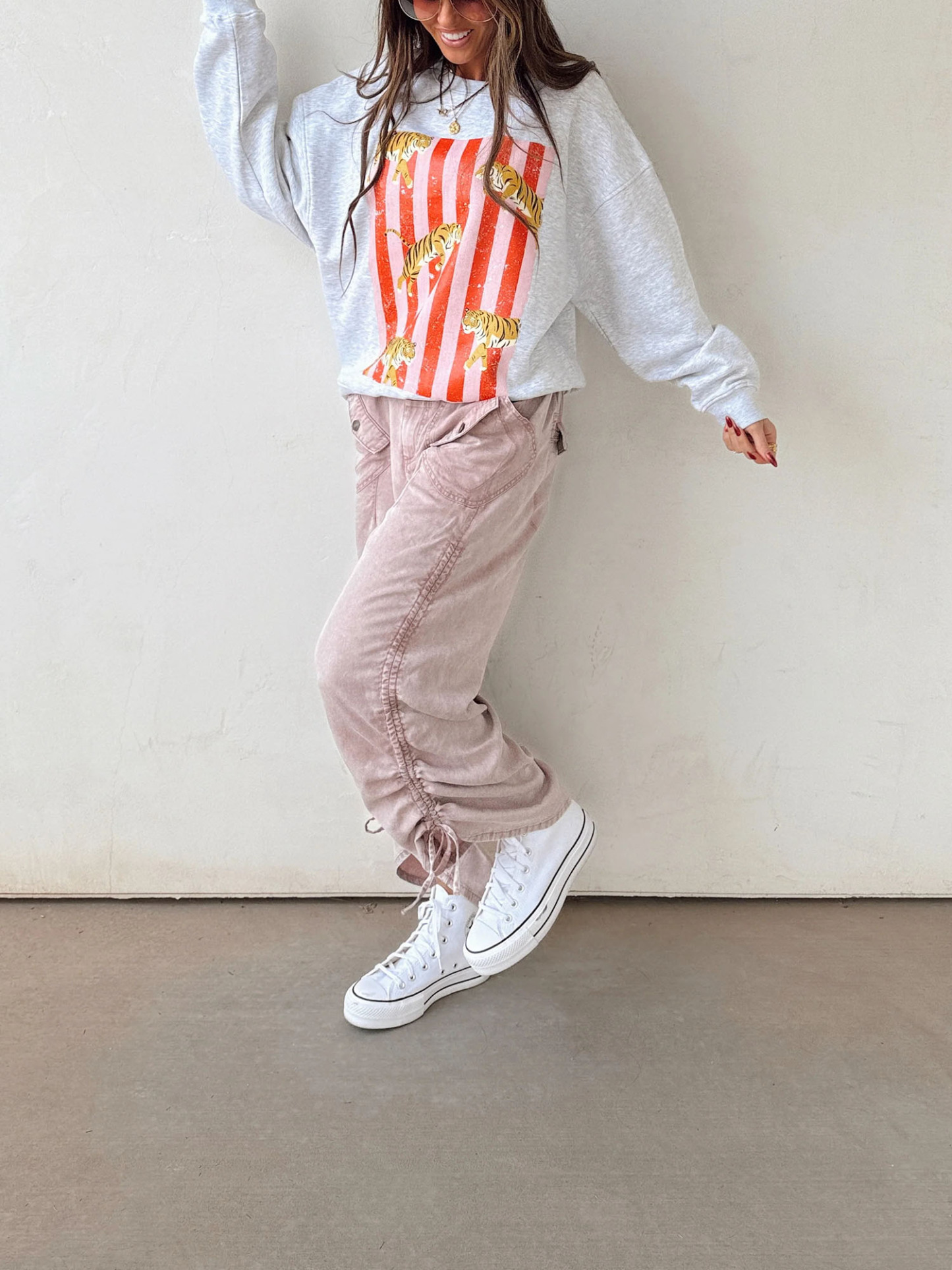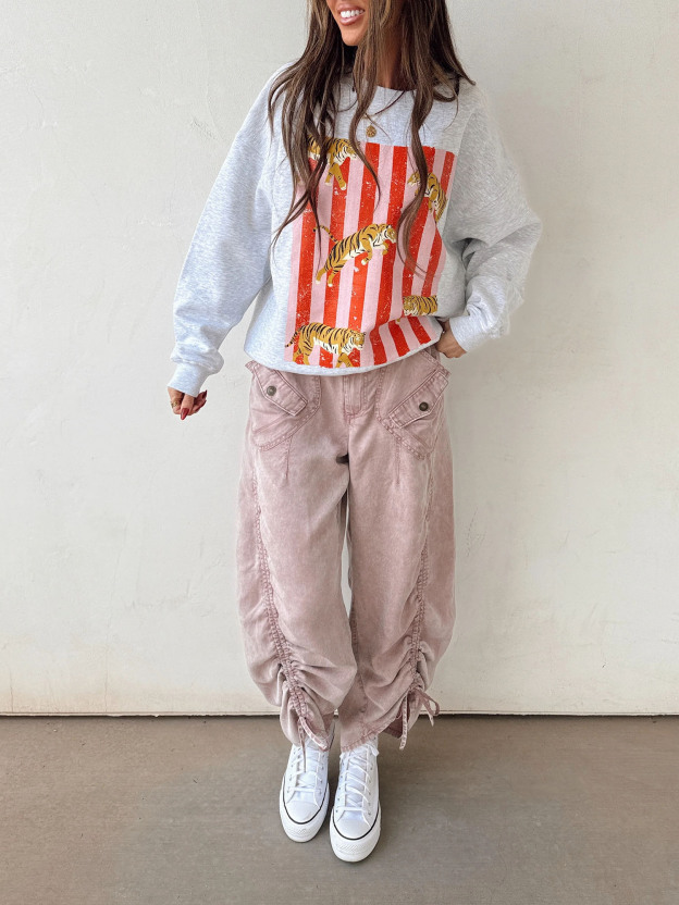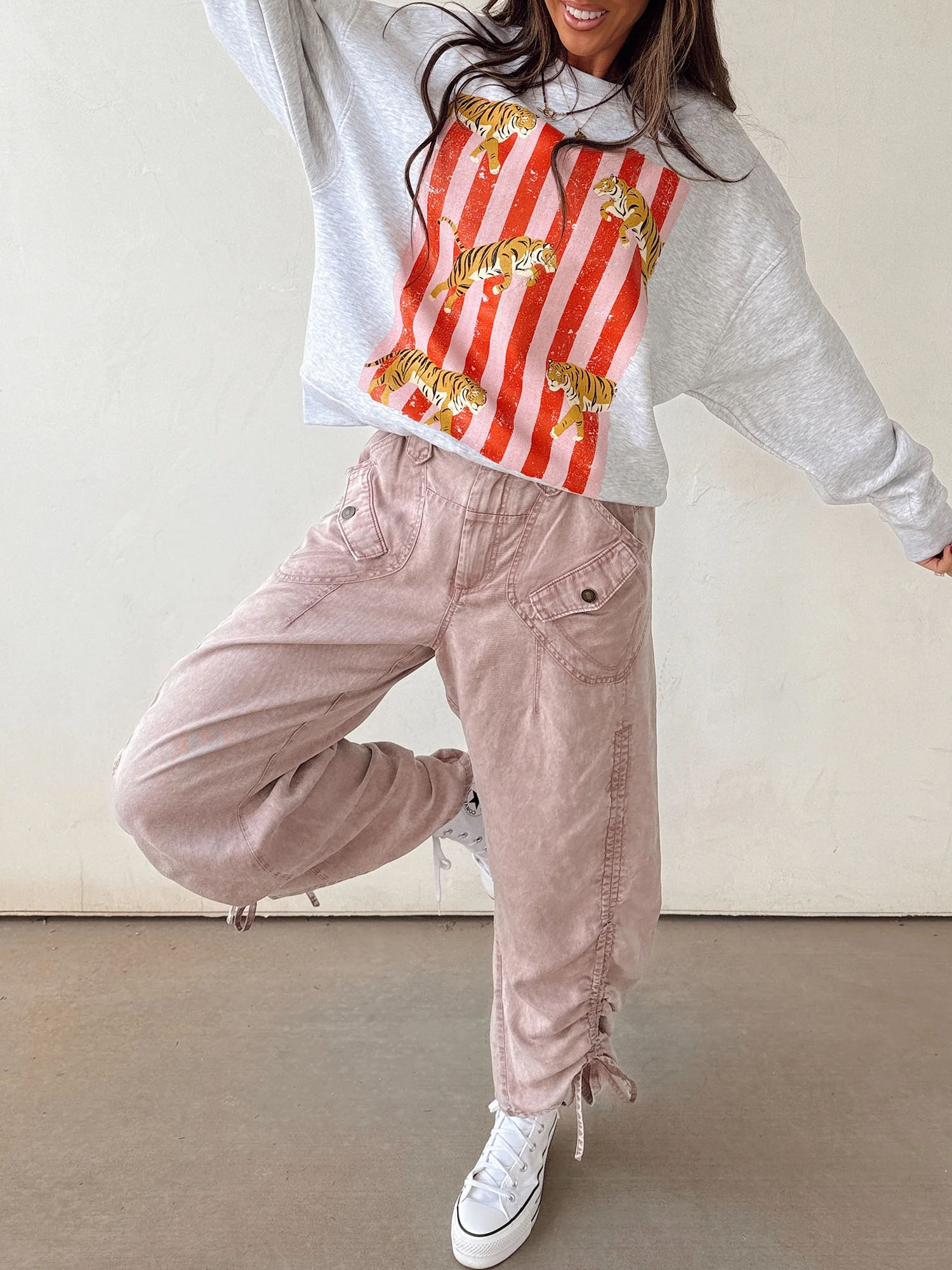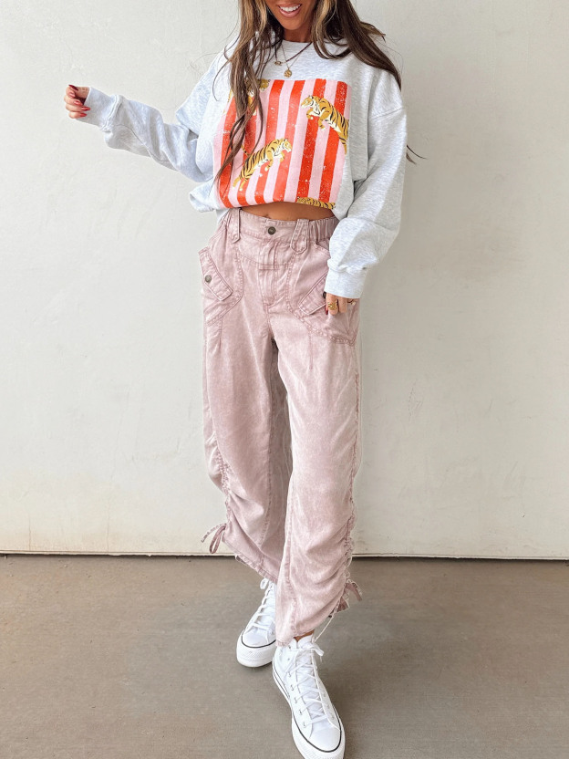 Embrace trendy casual style with these dusty pink wide-leg pants, featuring ruched side cuffs (adjustable with ties) and utility-style patch pockets. They have a relaxed high-waisted silhouette and soft fabric, blending playful detail with everyday comfort. Perfect for casual outings, street-style looks, or matched with oversized tops.