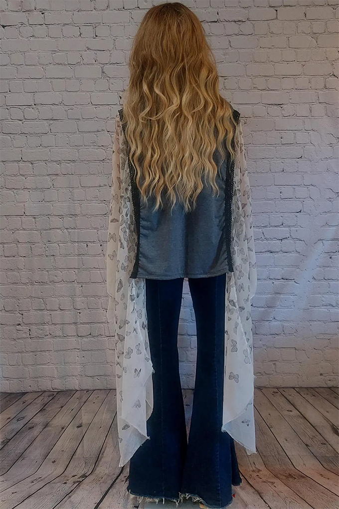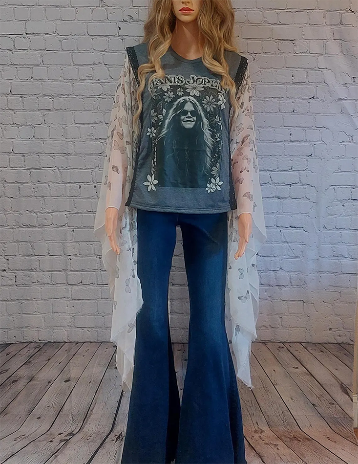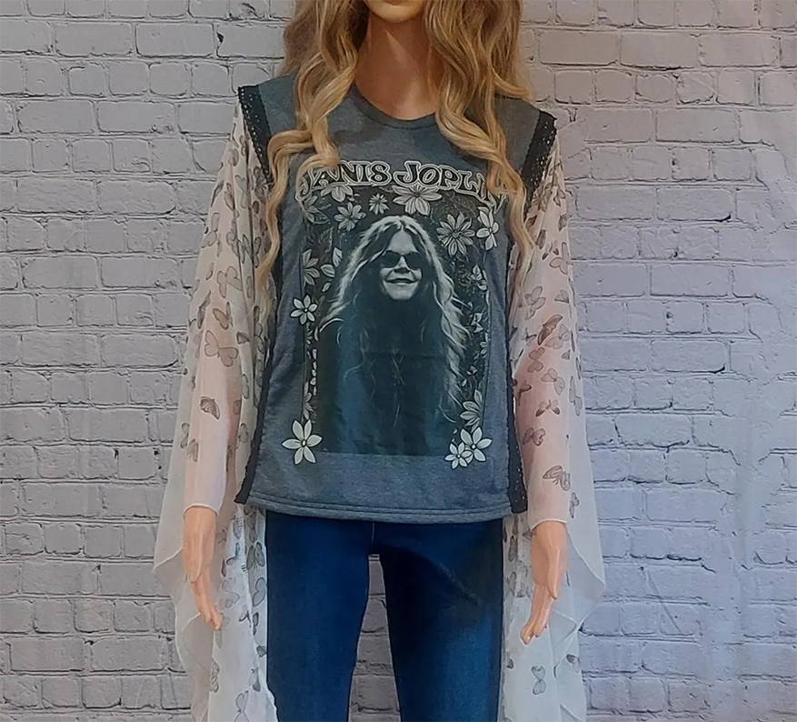 This listing is for a Upcycled vintage rock t shirt. This one of a kind reconfigured upcycled charcoal gray heather t top with a Janis Joplin has sheer butterfly print scarf sleeves in gray, black, cream , white sleeve/sides are finished with black cotton trim and frayed edges. Butterfly side sleeves are longer than the t shirt middle. This shirt is has an oversized fit will fit a women's size XS-L and will look different on every body type/shape. Please read the measurements before purchase. Top is hand made made out of repurposed new garments.
