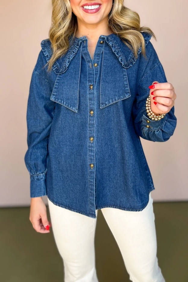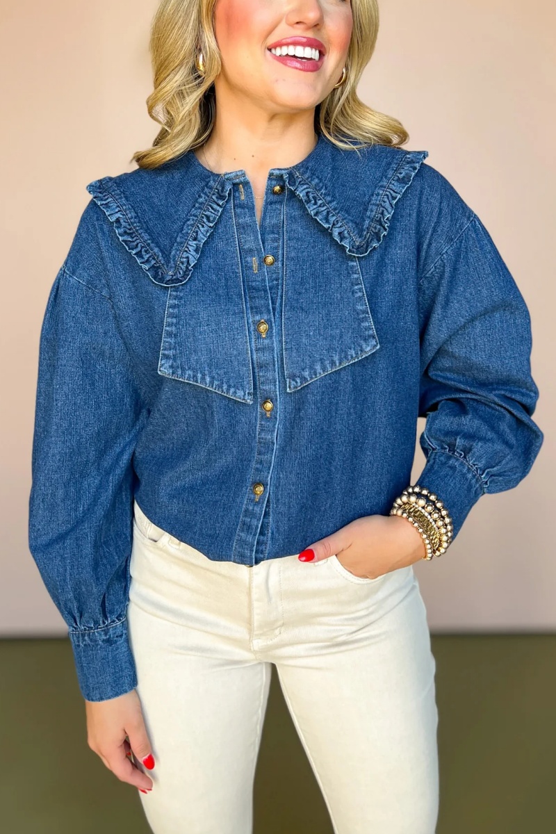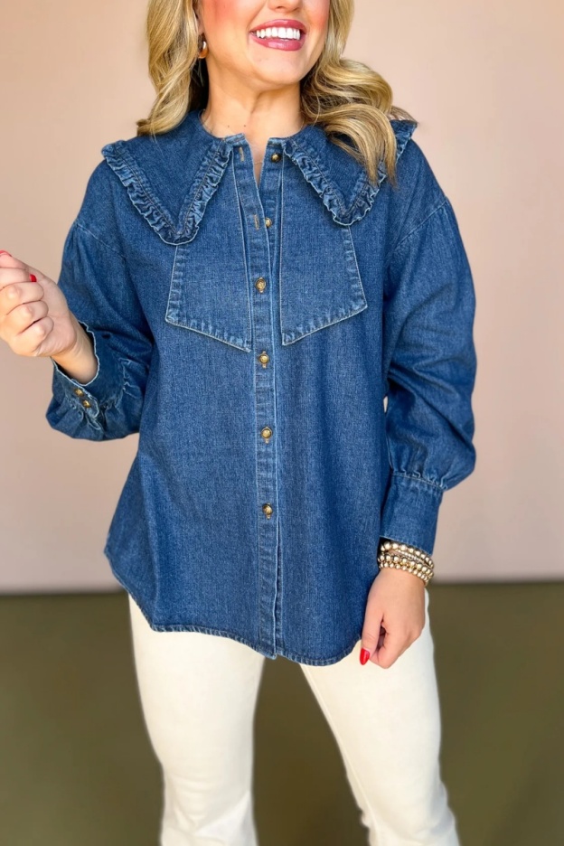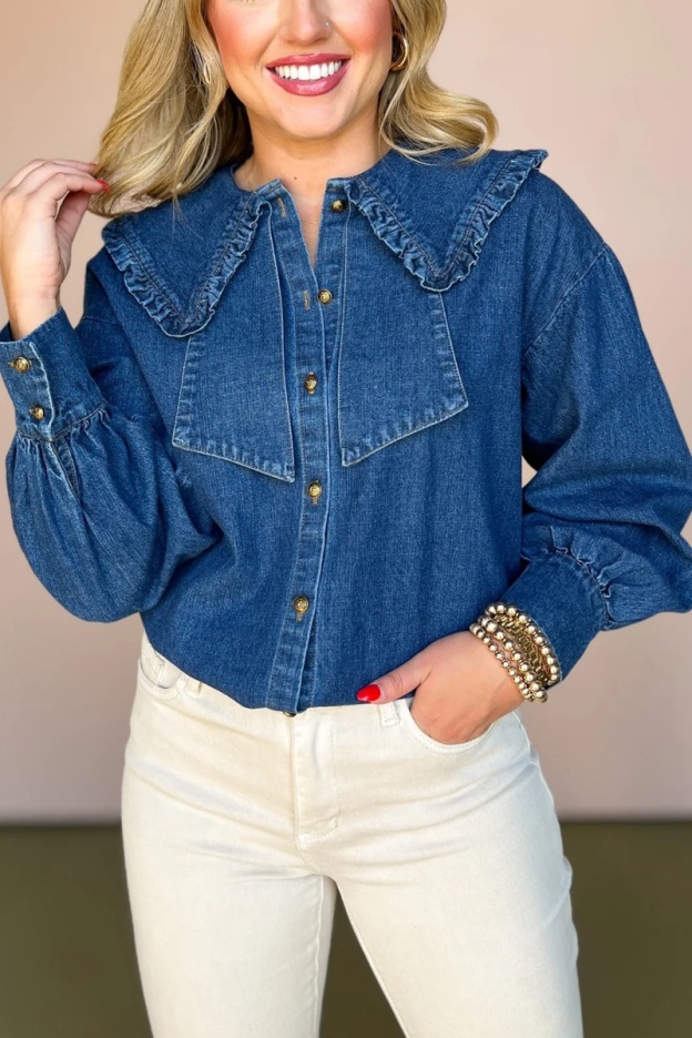 Denim Ruffed Peter Pan Collar Button Up Top