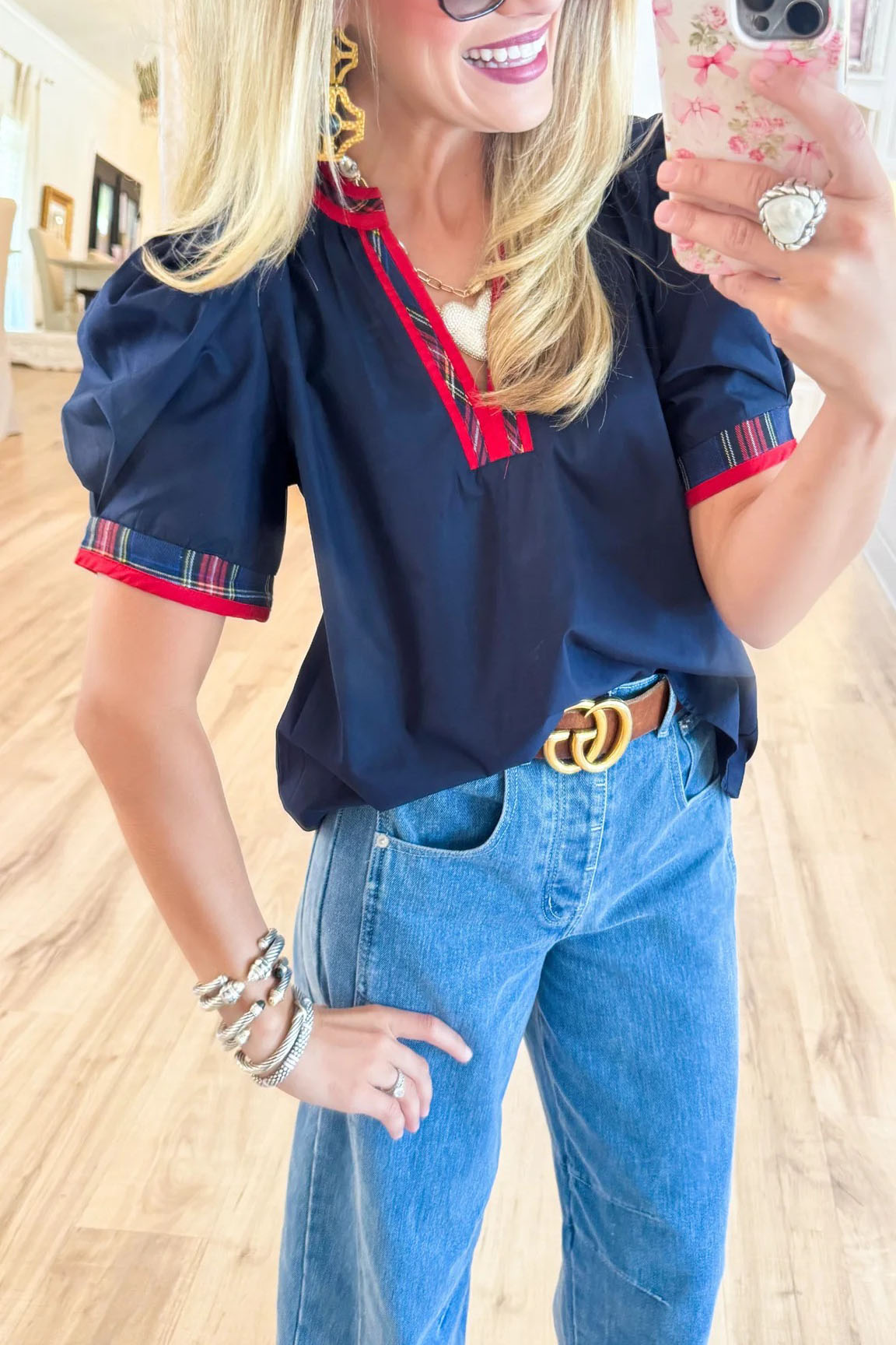 Navy Plaid Contrast Puff Sleeve Top